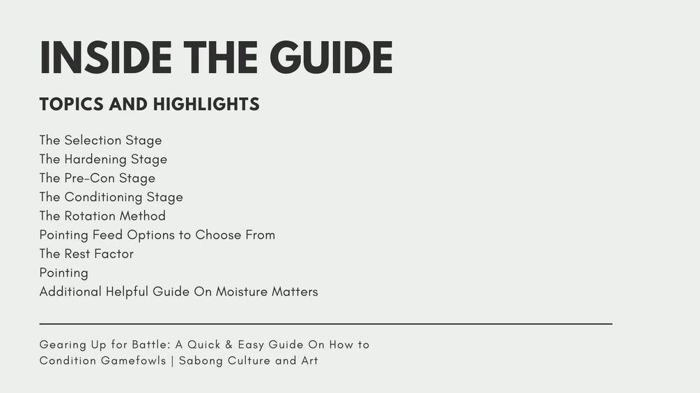 A Quick & Easy Guide 26 pages long downloadable print ready PDF on How to Condition Gamefowls in a presentation style with matching photos and key-point highlights perfect for those who don't have much time or find it difficult to read an entire bulky paperback. It saves you much time getting the same information as when reading an entire bulky book with its clean, doesn't suck visuals and easy-to-understand, straight to the point explanations. Topics and highlights include the following: The Selection Stage, The Hardening Stage, The Pre-Con Stage, The Conditioning Stage, The Rotation Method, Pointing Feed Options to Choose From, The Rest Factor, Pointing, and Additional Helpful Guide On Moisture Matters. You can open/read it using an app, on site, or download the file and store it on your preferred devices, be it a smartphone, tablet, laptop, or iPad.